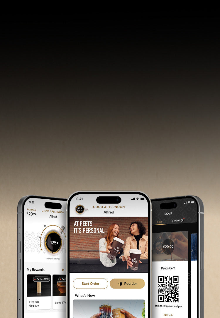 Download the app that offers perks with your pour. Unlock Peet's full menu, customize to your taste, order ahead for easy pickup, and watch rewards roll in.