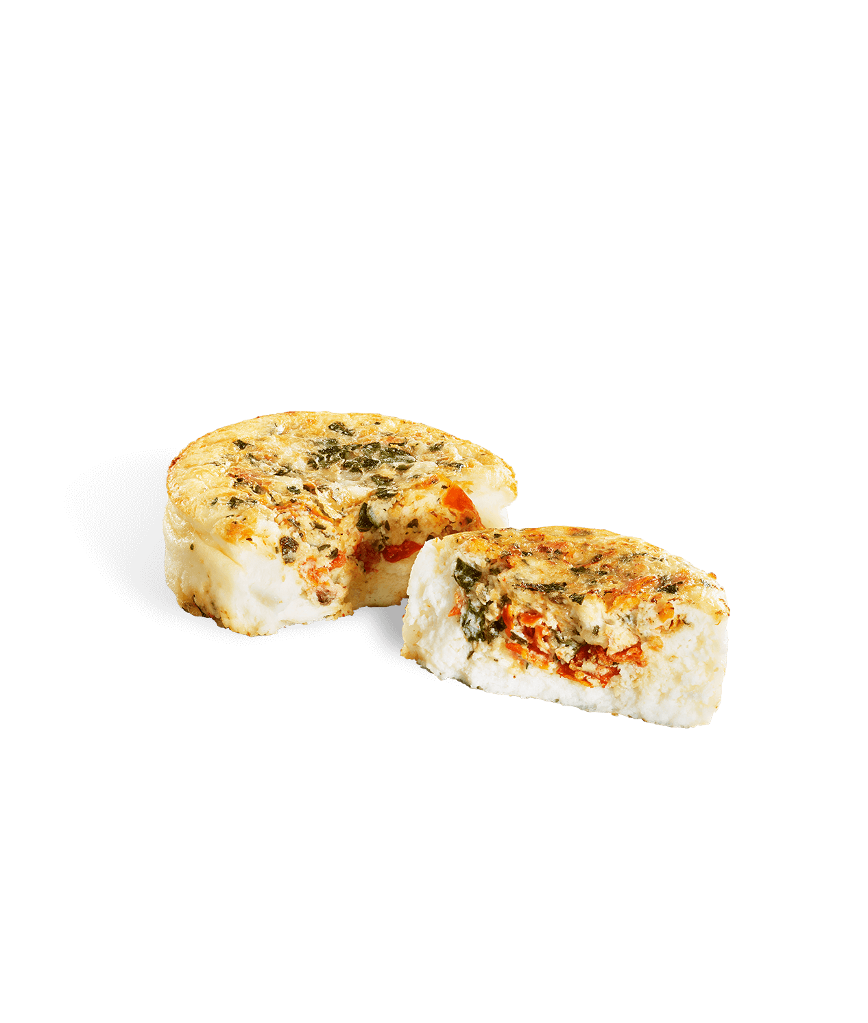 Egg whites whipped with nonfat yogurt, a touch of cream and cheese, and chunks of roasted tomatoes and kale. Made without wheat.