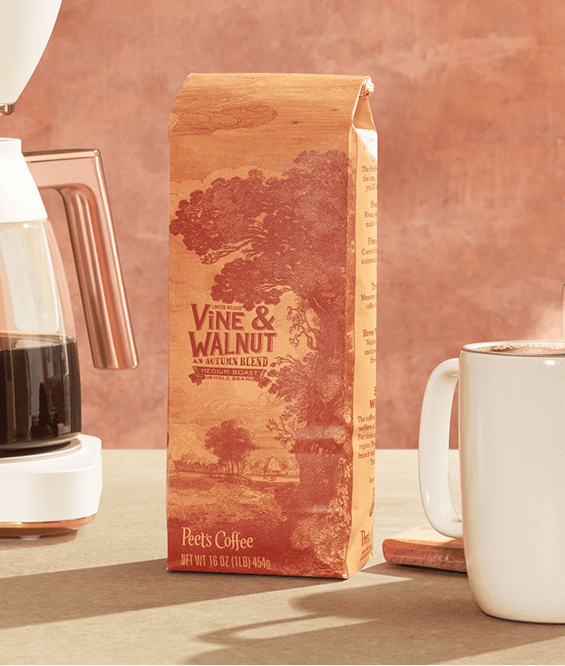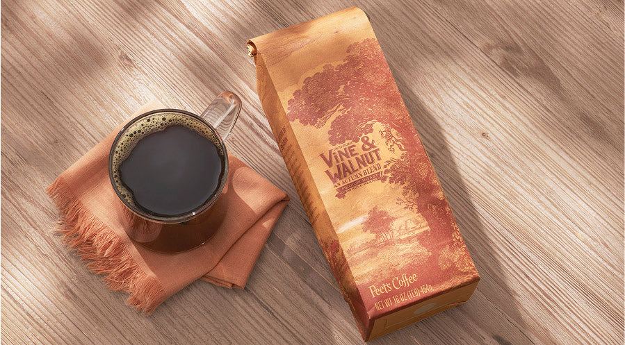 Vine & Walnut 2025 is a full-throated medium roast that sings with fall flavor. It offers all the fall notes—tart cherry pie, warm baking spices like cinnamon and allspice, dried orange peel, and whispers of white oak from a well-loved wine barrel. This layered experience is shaped by coffees from three origins and three distinct processing methods: naturally processed Ethiopian Guji brings bright fruit and floral aromatics; wet-hulled Bali Blue Moon lends rich spice, body, and earthy depth; and fully washed Panama Don Bosco adds elegant acidity...